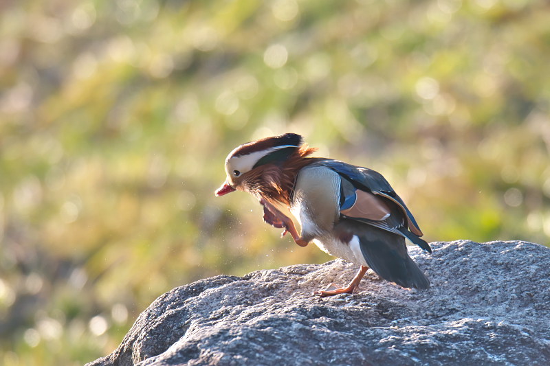 眩しい朝の光を受けて凛々しく立つオシドリ。